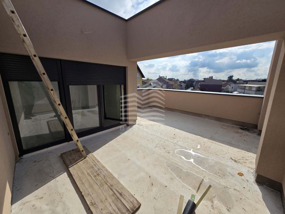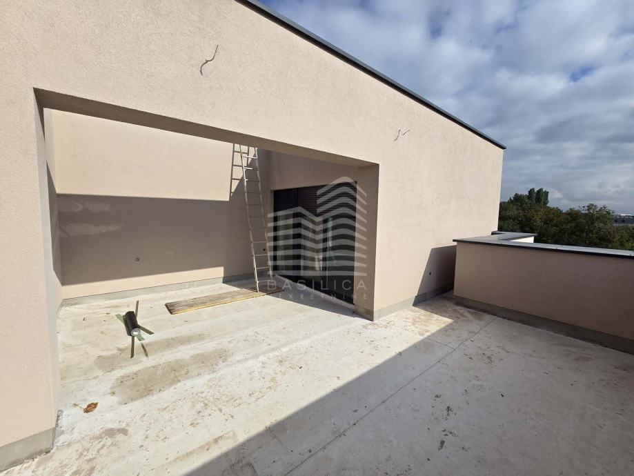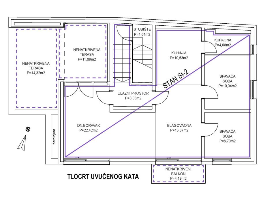 Stan oznake ST2, nalazi se na 2. katu (zadnjem), penthouse, trenutačno je komotan trosoban, po želji se može izvesti u 4s ili 5s (u prilogu tlocrti sa prijedlogom pregradnje, sve je pripremljeno od instalacija u zidovima za pregradnju), te se sastoji od: ulaznog prostora (8,03m2), kuhinje (10,53m2), blagovaonice (13,87m2), dnevnog boravka (22,42m2), kupaonice (4,08m2), sobe (10,04m2), sobe (8,70m2), ukupne stambene površine 77,67m2, te terase od 25,41m2 (obračunski 6,35m2), i balkona od 4,19m2 (obračunski 1,05m2). Uz stan idu dva parkirna mjesta od 12,19m2 (obračunski 2 x 3,05m2), te spremište u podrumu zgrade od 8,13m2 (obračunski 6,1m2). Ukupna prodajna površina je 97,27m2.