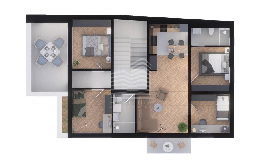 Trokut, manja zgrada u završnoj fazi gradnje (dovršetak kraj 2025.g.), koja se sastoji od podruma, prizemlja i 2 kata (ukupno 5 stanova). Preostala su još dva slobodna stana (prizemlje 2s od 60m2 i zadnji kat penthouse od 97m2).