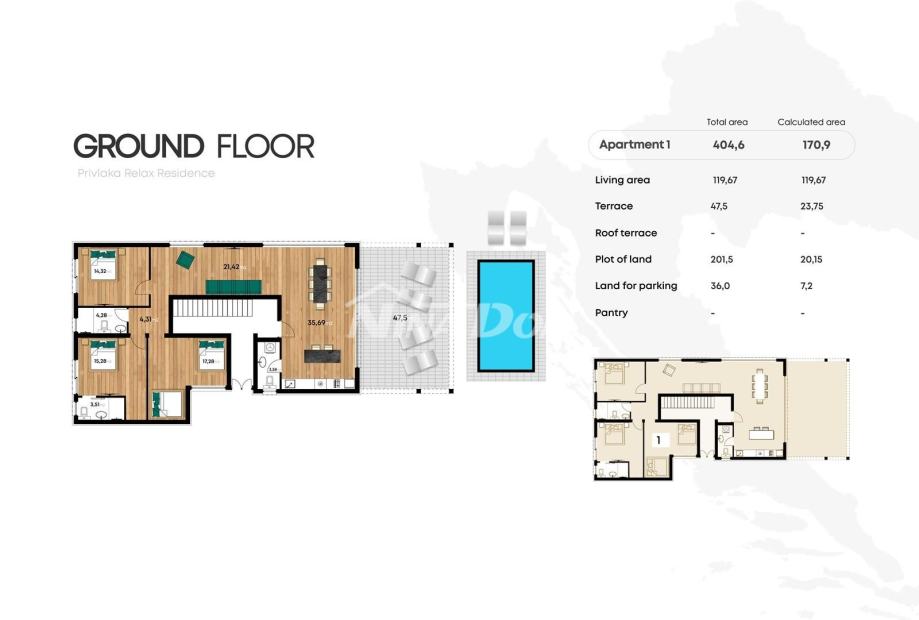U nastavku se prostire terasa površine 47,5 m2 s okućnicom od 202 m2, ukupne bruto površine 404,60 m2.