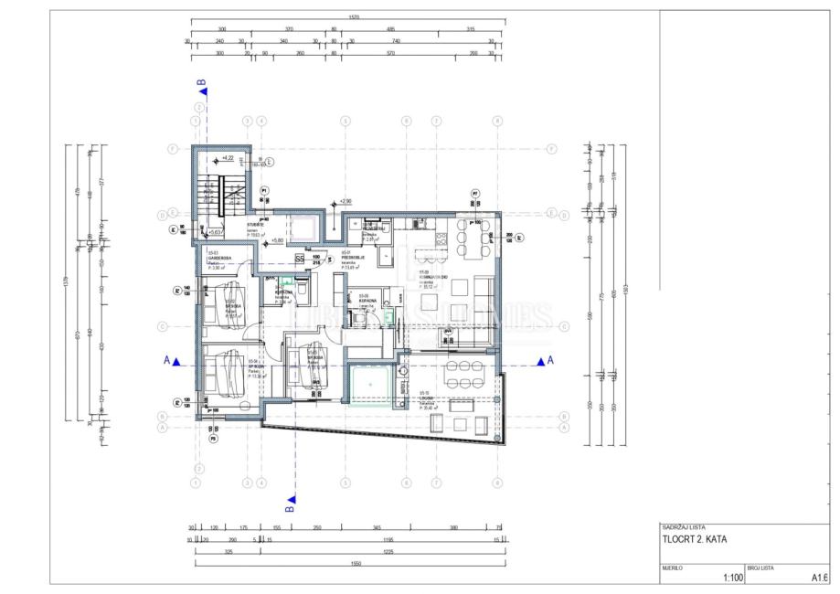 Sastoji se od ulaznog predsoblja, garderobe, dvije kupaonice, tri spavaće sobe, te otvorenog dnevnog prostora koji uključuje kuhinju, blagovaonicu i dnevni boravak s izlazom na prostranu loggiu površine 35,40 m² s koje se pruža pogled na more.