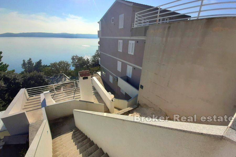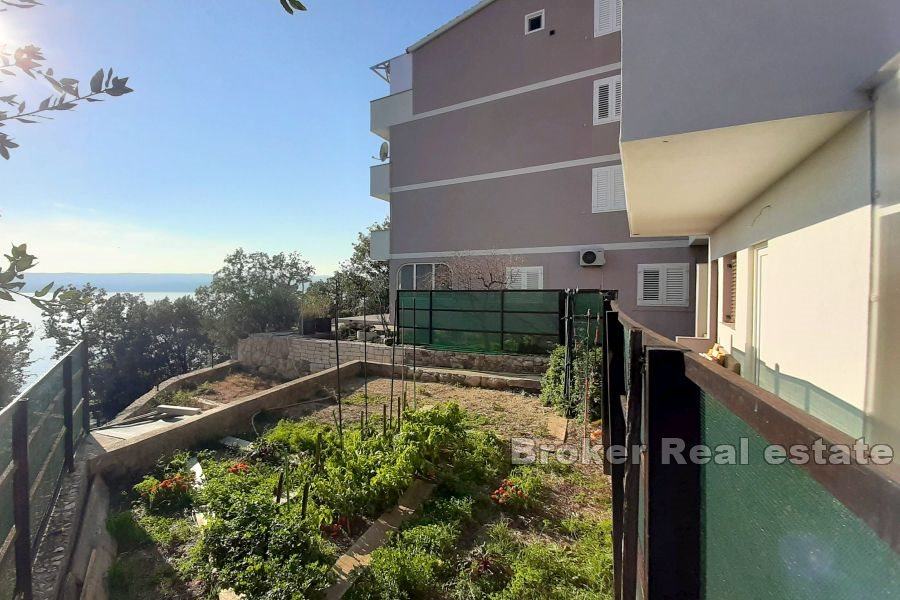 Prostrani moderni trosobni stan, na prodaju, ukupne stambene površine od 133 m2, smješten u prizemlju stambene zgrade na Omiškoj rivijeri, sa prostranim pripadnim vrtom, parkingom i pogledom na more.