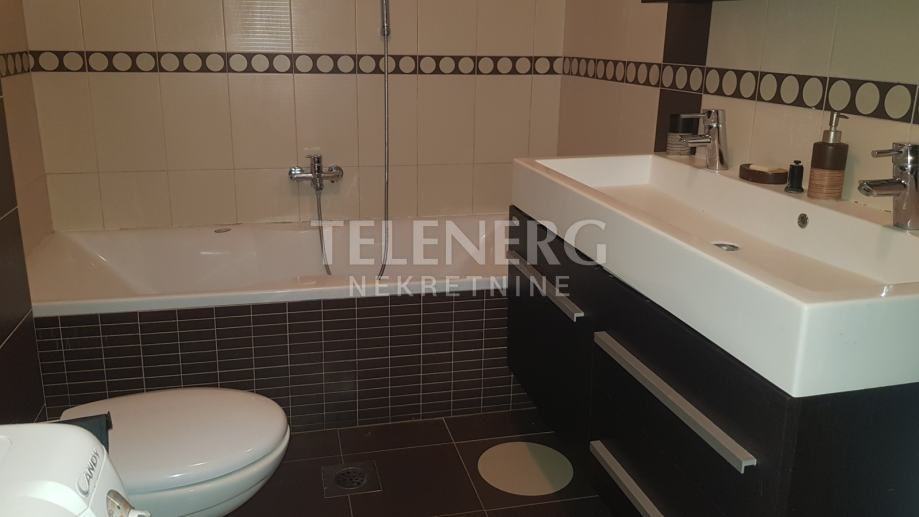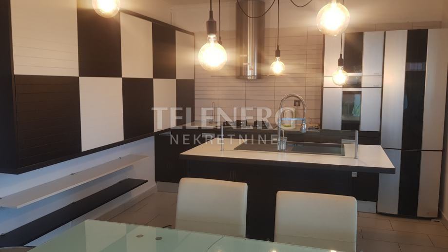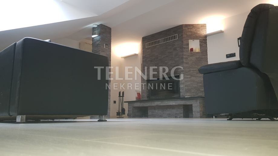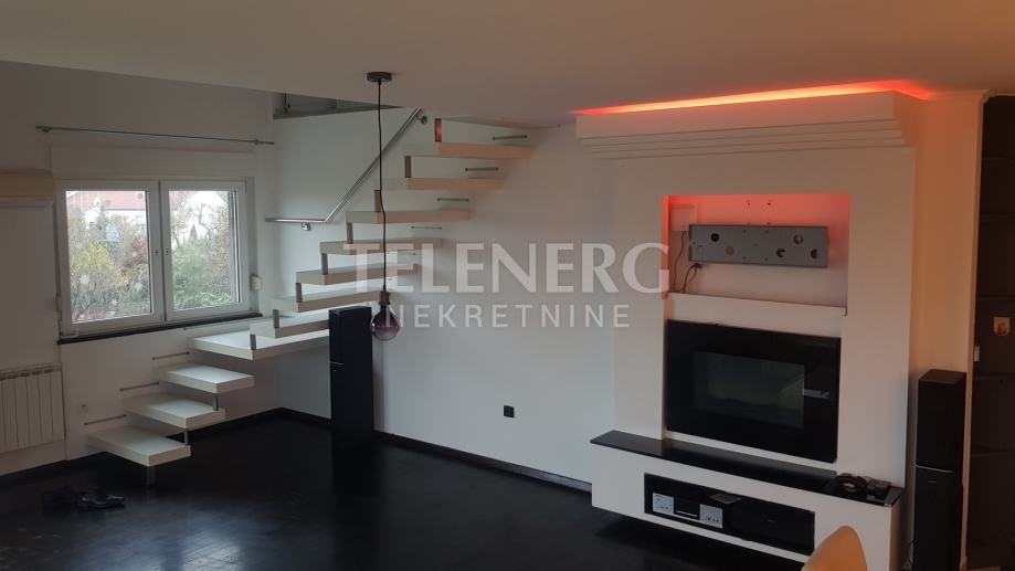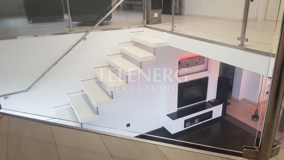 Na donjoj etaži se nalazi spavaća soba, kupaona sa kadom, dnevni boravak sa kuhinjom (pininfarina uređaji).