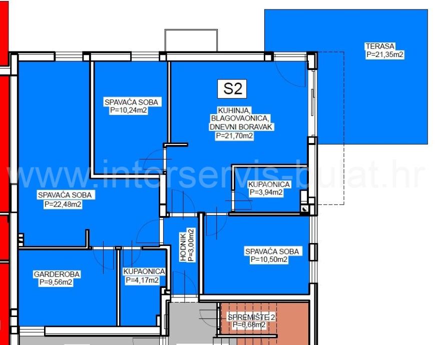 Stan se sastoji od kuhinje s blagovaonom i dnevnim boravkom sa terasom površine 21m2, kupaone i tri spavaće sobe od kojih jedna posjeduje vlastitu kupaonicu i garderobu. Stanu pripada garažno mjestu površine 12,98m2 u podrumu zgrade i dvorište 51,37m2.