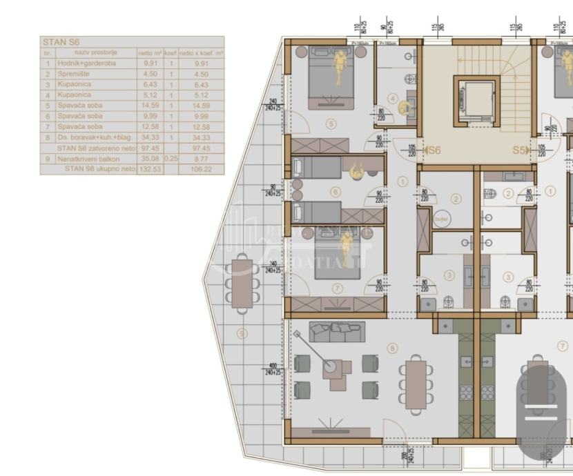 Stan ukupne površine 106,22 m² (bruto 132,53 m²) odlikuje se izuzetno promišljenim rasporedom i obiljem prirodnog svjetla.
