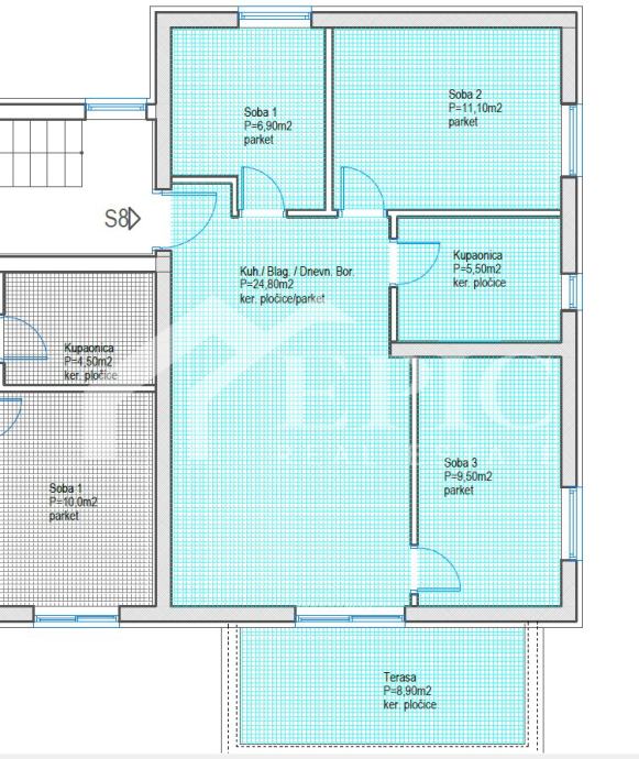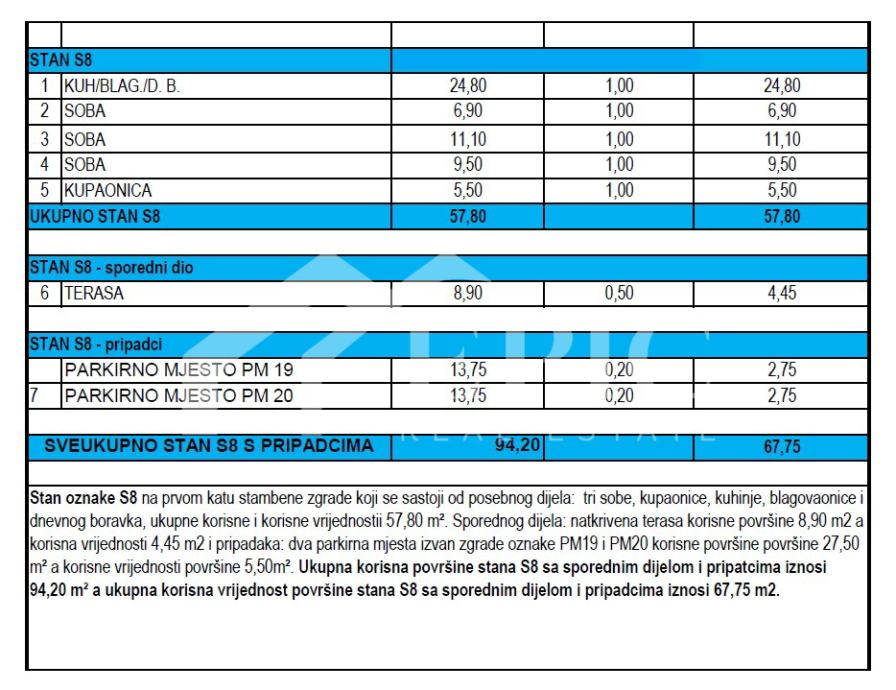 Stan oznake S8 u zgradi s osam stambenih jedinica, sastoji se od - kuhinje s blagovaone i dnevnog boravka, triju spavaćih soba, kupaonice i natkrivene terase. Stanu pripadaju i dva parkirna mjesta. Ukupna korisna površine stana sa sporednim dijelom i pripatcima iznosi 94,20 m2 a ukupna korisna vrijednost površine stana iznosi 67,75 m2.