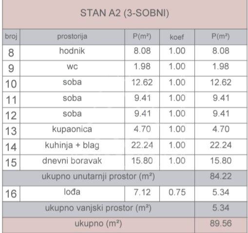 ZGRADA A, STAN A2, TROSOBAN, nalazi se na 2. katu i sadrži: hodnik (pov. 8.08 m2), dnevni boravak (pov. 15.80 m2), blagovaonicu s kuhinjom (pov. 22.24 m2), tri spavaće sobe (pov. 12.62 m2, 9.41 m2 i 9.41 m2), kupaonicu (pov. 4.70 m2), WC (pov. 1.98 m2) i loggia-u. (pov. 7.12 m2).