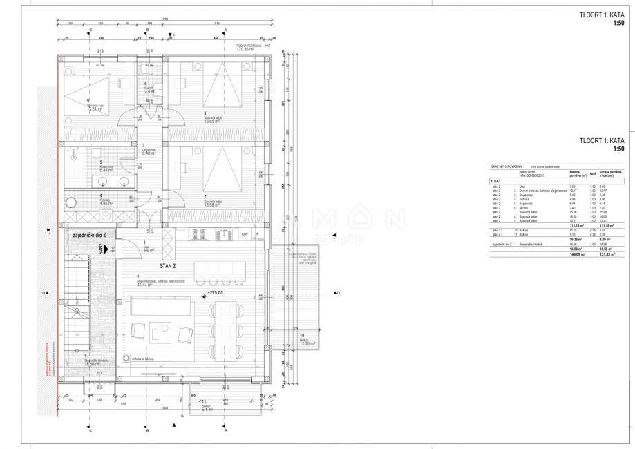 Tlocrti su vrlo funkcioni. Ulazi se u hodnik, odnosno predsoblje iz kojeg se s jedne strane dolazi do dnevnog dijela, odnosno open space dnevnog boravka s kuhinjom i blagovaonom, te dvije terase, a s druge strane ide se u tri spavaće sobe, kupaonicu, gostinjski wc i vešeraj.