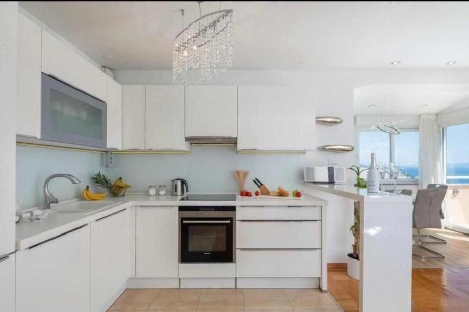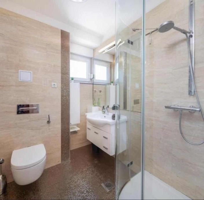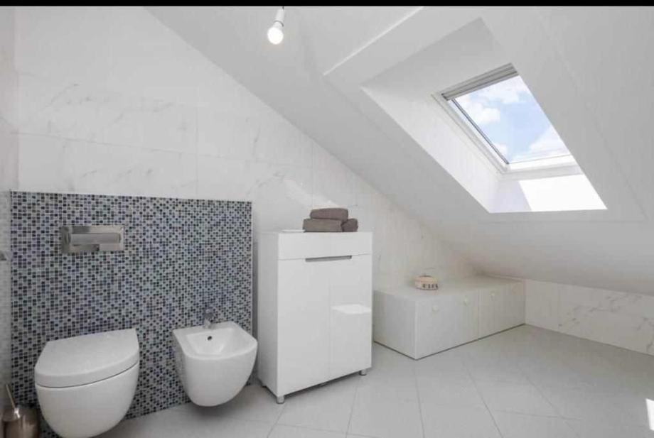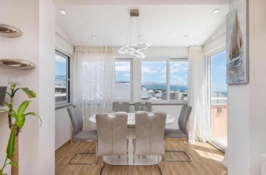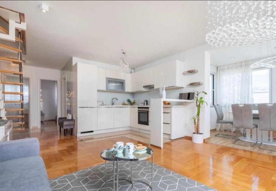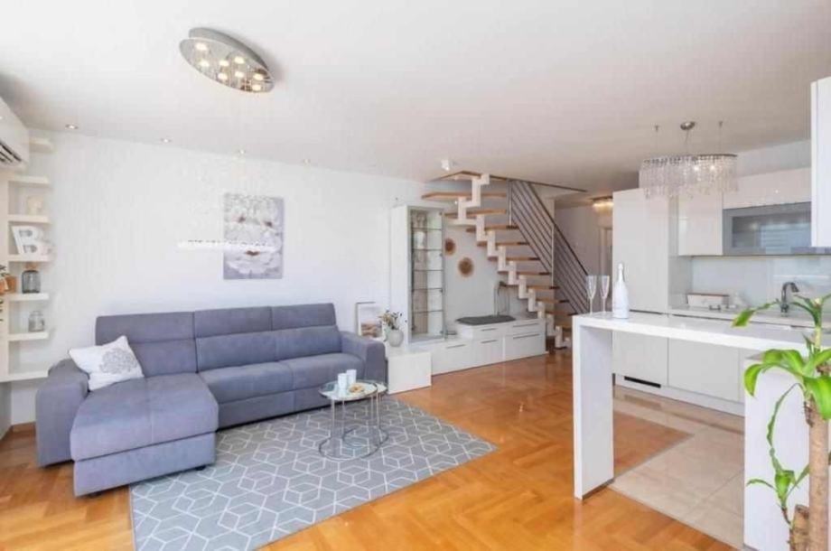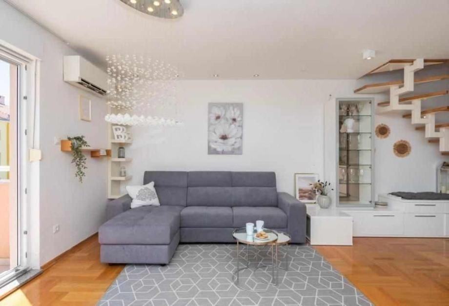 We mediate the rental of a two-story apartment in Split, district Žnjan. The apartment is located on the 3rd floor of a smaller residential building in a quiet and intimate location. On the first floor, there is a spacious kitchen with a dining room and a living room ("open space"), which is surrounded on all sides by a glass wall, due to which the apartment is flooded with sunlight throughout the day. The living room opens onto a south-facing balcony with a panoramic view of the sea. On this floor there is also one bedroom with a double bed, a children's room and a bathroom. On the upper floor (attic) there is a room with a double bed, a separate toilet and an anteroom suitable for children's play.