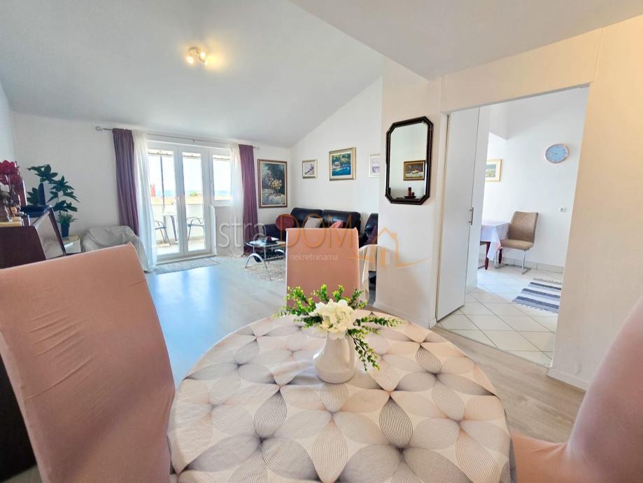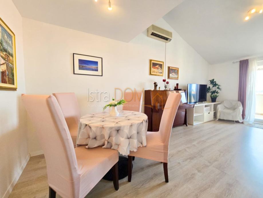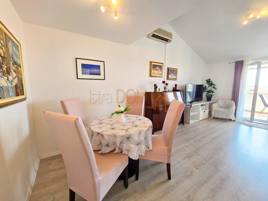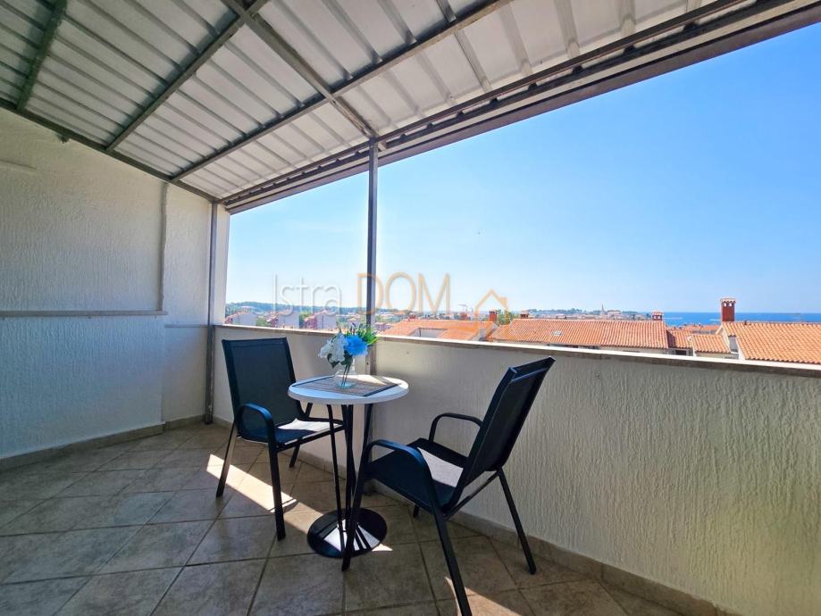 Smješten na posljednjem katu stambene zgrade, stan pruža predivan panoramski pogled na more i staru jezgru Poreča, koji se posebno ističe s prostranog balkona – idealnog mjesta za opuštanje uz zalazak sunca.