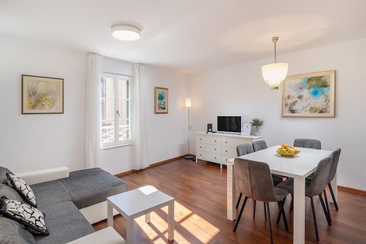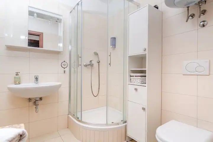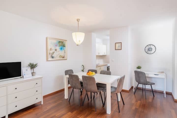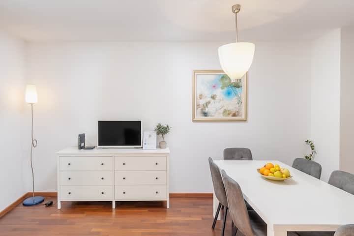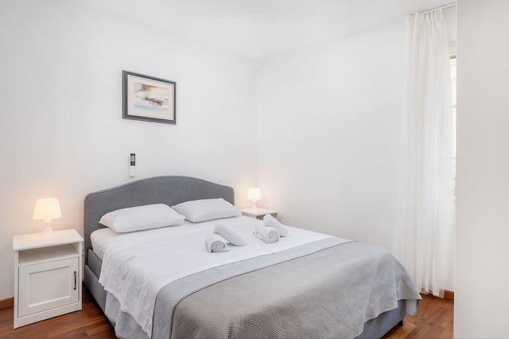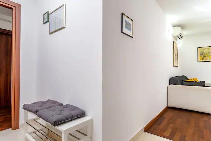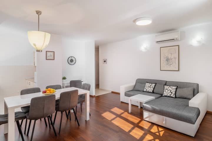 Smješten je u novoj zgradi s liftom, ovaj se stan nalazi na drugom katu. Ima prostrani dnevni boravak, potpuno opremljenu kuhinju, 3 spavaće sobe, 1 kupaonicu s podnim grijanjem i 1 WC. Spavaće sobe i dnevni boravak imaju klima-uređaj, a u cijelom stanu osiguran je WiFi velike brzine.