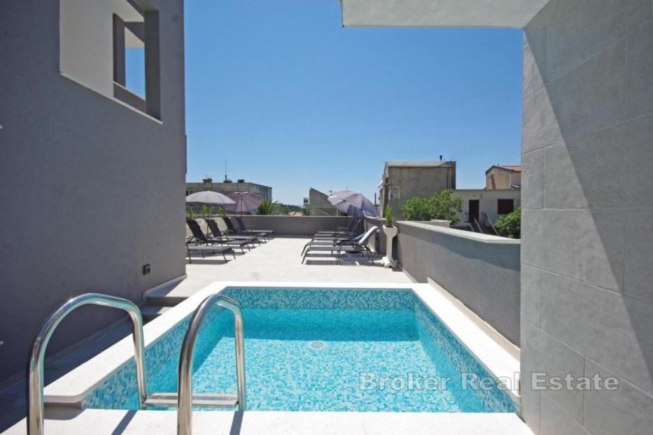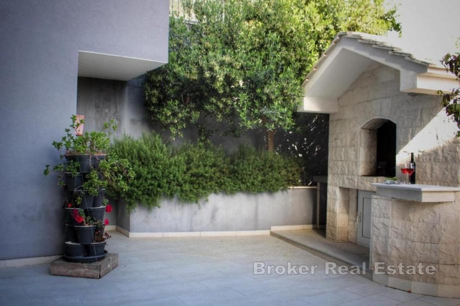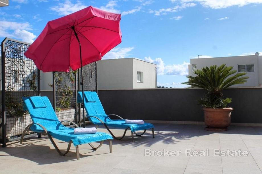 Stan je moderno uređen, potpuno opremljen i prilagođen potrebama gostiju, s kuhinjom i dnevnim boravkom, izlazom na prostranu terasu površine 30 m² te sobama s vlastitim kupaonicama. Terasa je idealna za opuštanje i druženje na otvorenom, a zbog svoje kvadrature i položaja čini stan iznimno atraktivnim i ugodnim za boravak.