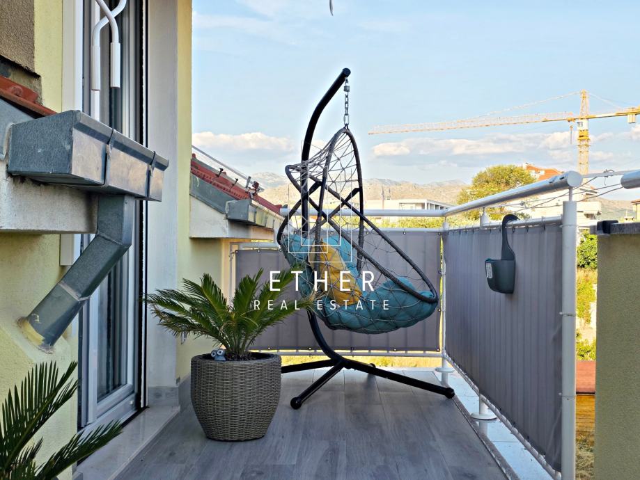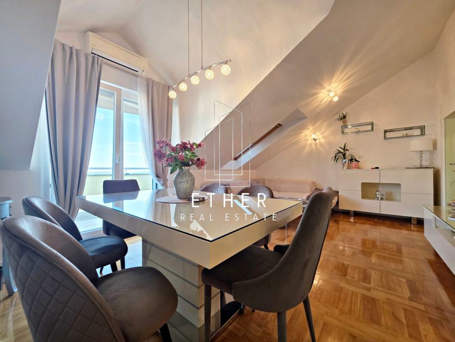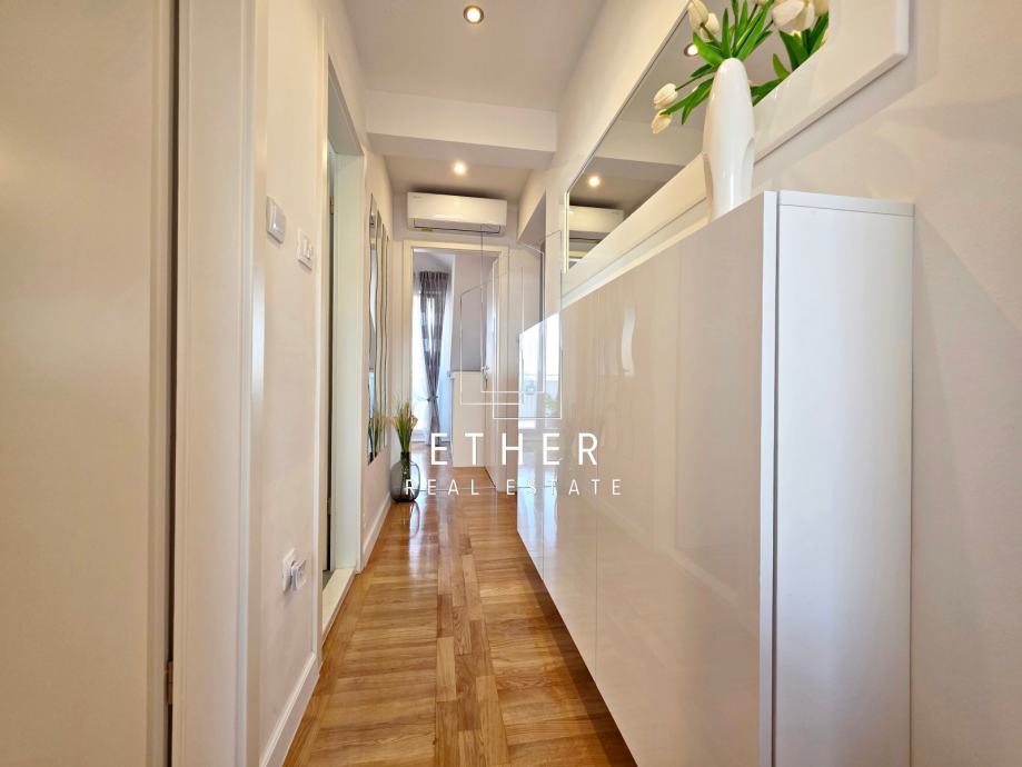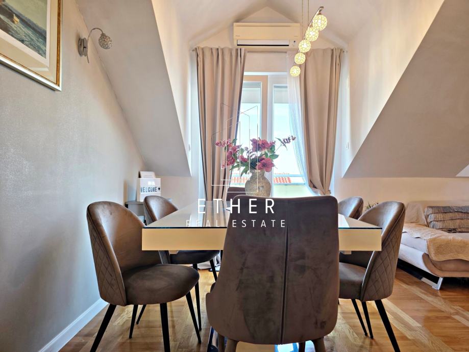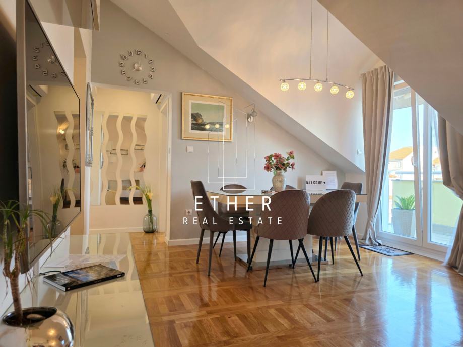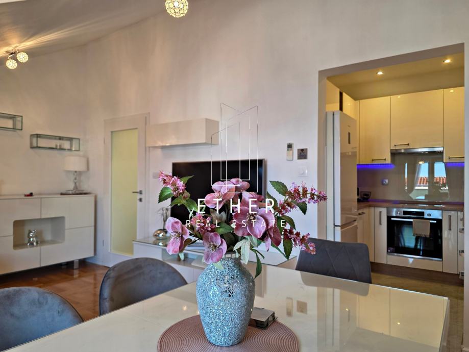 Moderan i prostran trosobni stan smješten u mirnom i atraktivnom dijelu grada. Sastoji se od tri spavaće sobe, dvije potpuno opremljene kupaonice, dnevnog boravka povezanog s kuhinjom i blagovaonicom, te balkona s prekrasnim pogledom na more.