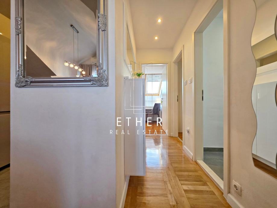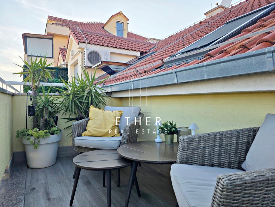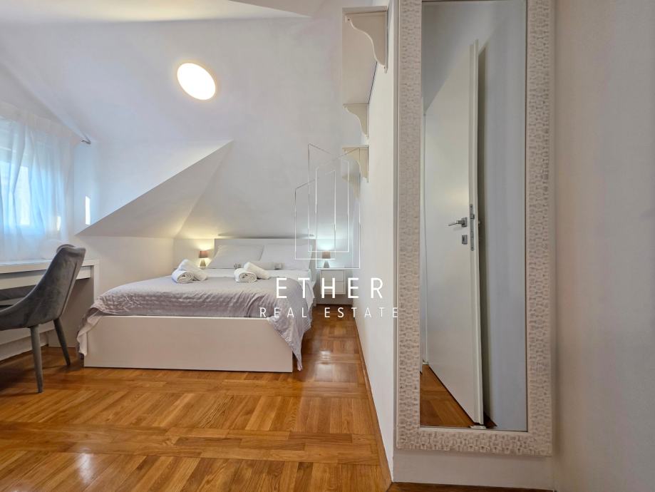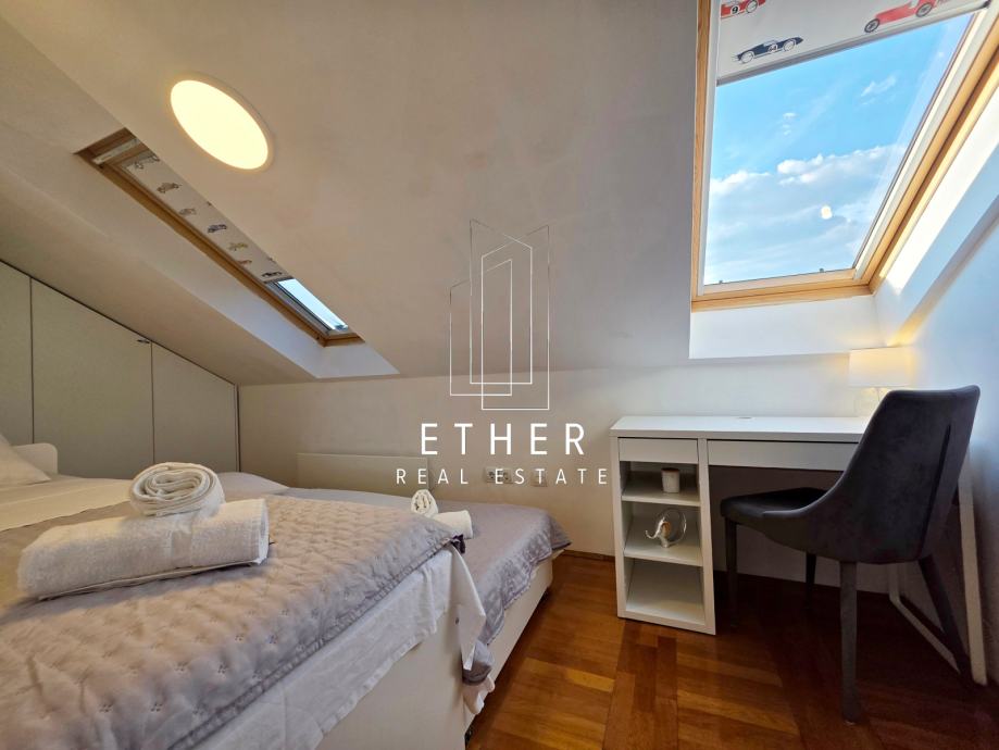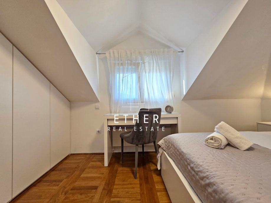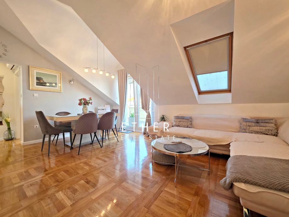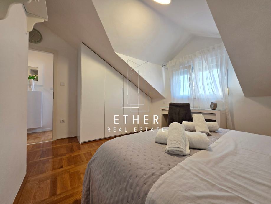 Moderan i prostran trosobni stan smješten u mirnom i atraktivnom dijelu grada. Sastoji se od tri spavaće sobe, dvije potpuno opremljene kupaonice, dnevnog boravka povezanog s kuhinjom i blagovaonicom, te balkona s prekrasnim pogledom na more.