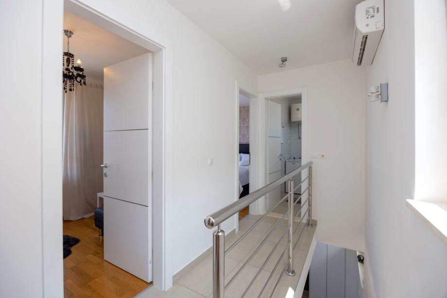Na drugoj etaži smještene su tri spavaće sobe s pogledom na more i zajednička kupaonica.