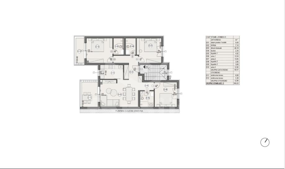 Na 2. katu moderne zgrade nalazi se trosoban stan ukupne površine 105,03 m2, od čega 92,07 m2 čini zatvoreni stambeni prostor, dok dodatnih 12,96 m2 pripadaju dvjema natkrivenim terasama. Stan je izuzetno promišljeno raspoređen i sastoji se od prostranog ulaznog prostora / hodnika , odvojene kuhinje, velikog i svijetlog dnevnog boravka, 3 komforne spavaće sobe, čak 3 kupaonice, što je rijetkost i velika prednost u svakodnevnom životu, dodatnog hodnika koji povezuje privatni dio stana i dvije natkrivene terase, idealne za jutarnju kavu ili večernji odmor.