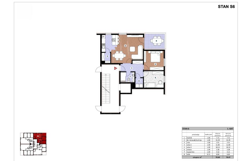 Stanovi su pažljivo projektirani s naglaskom na visoku funkcionalnost, optimalan raspored prostorija te maksimalnu iskorištenost prirodnog svjetla. Svaki stan ima prostranu terasu koja dodatno doprinosi kvaliteti stanovanja. Korištenjem provjerenih izvođača i pažljivo odabranih materijala osigurana je visoka razina udobnosti i dugotrajnosti.