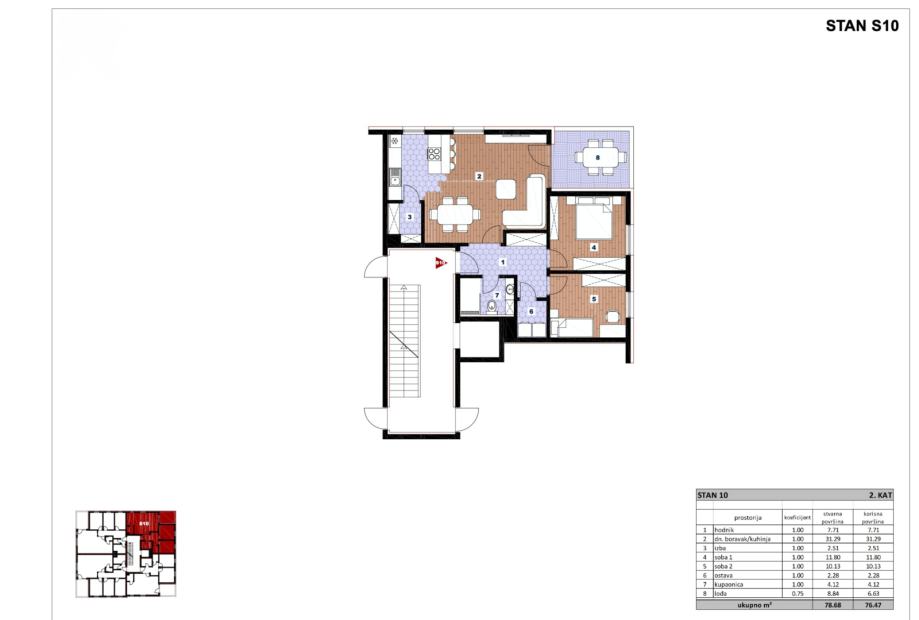 Stanovi su pažljivo projektirani s naglaskom na visoku funkcionalnost, optimalan raspored prostorija te maksimalnu iskorištenost prirodnog svjetla. Svaki stan ima prostranu terasu koja dodatno doprinosi kvaliteti stanovanja. Korištenjem provjerenih izvođača i pažljivo odabranih materijala osigurana je visoka razina udobnosti i dugotrajnosti.