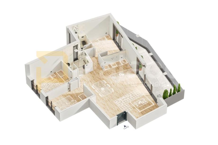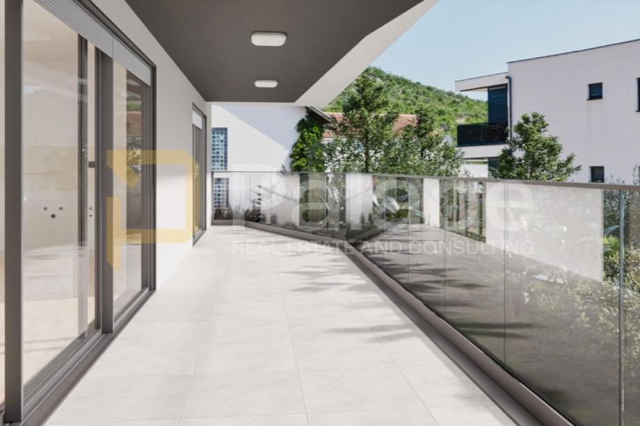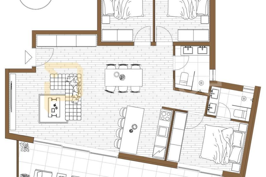 Stan se sastoji od tri prostrane spavaće sobe (svaka po 10m2), dvije kupaonice, dnevnog boravka i kuhinje povezanih u otvoreni koncept i velike terase od 25m2.