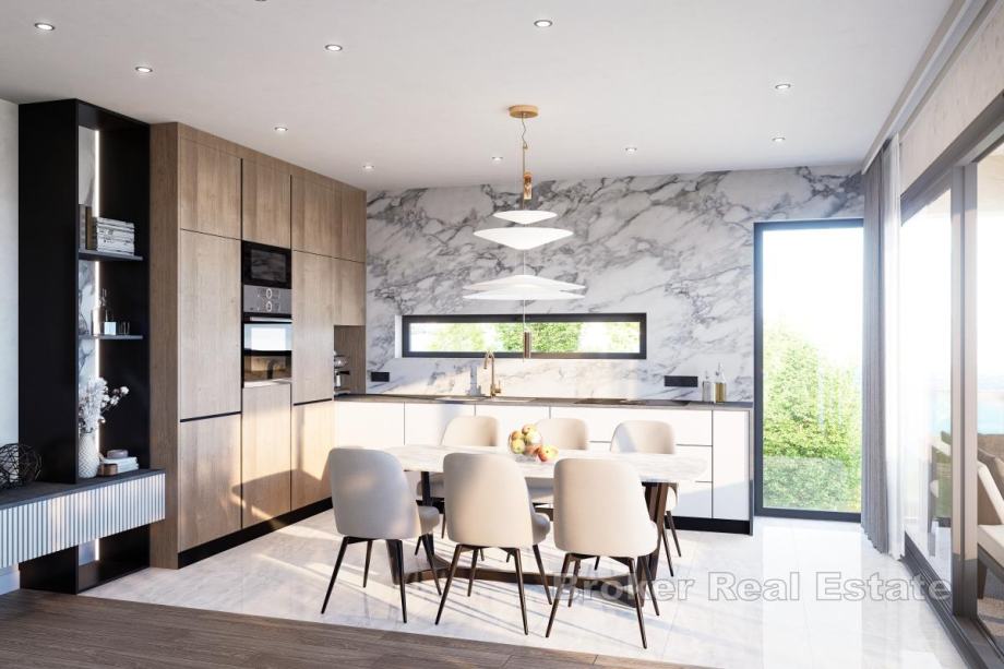 Posebna pažnja posvećena je kvaliteti gradnje i izboru materijala – korištene su vrhunske pločice i sanitarije, a u svakoj prostoriji postavljen je klima uređaj za ugodnu temperaturu tijekom cijele godine. Protuprovalna vrata i mogućnost personaliziranog uređenja interijera u suradnji s profesionalnim dizajnerima interijera dodatno podižu standard ove nekretnine.