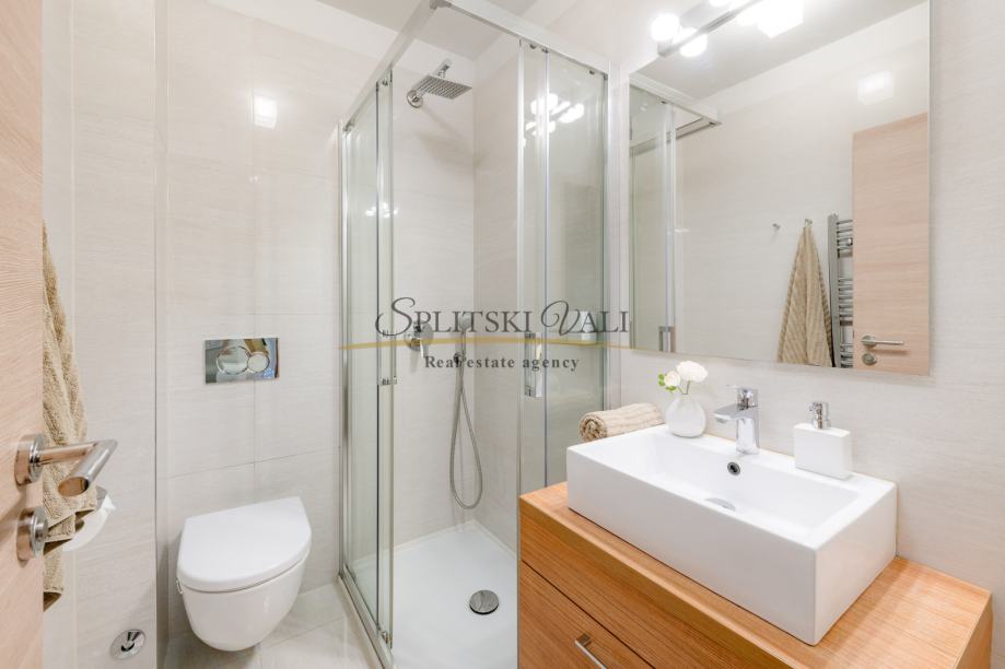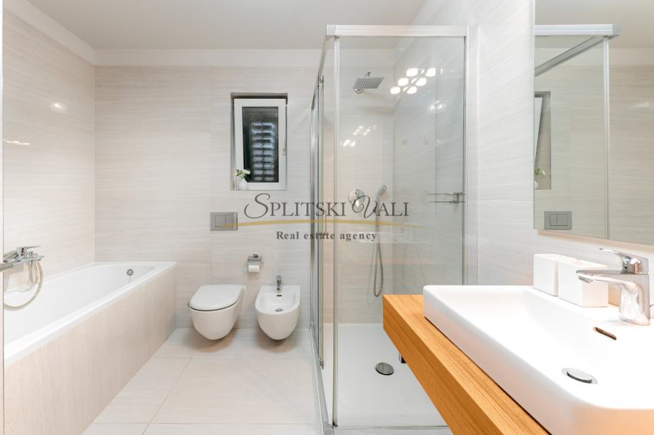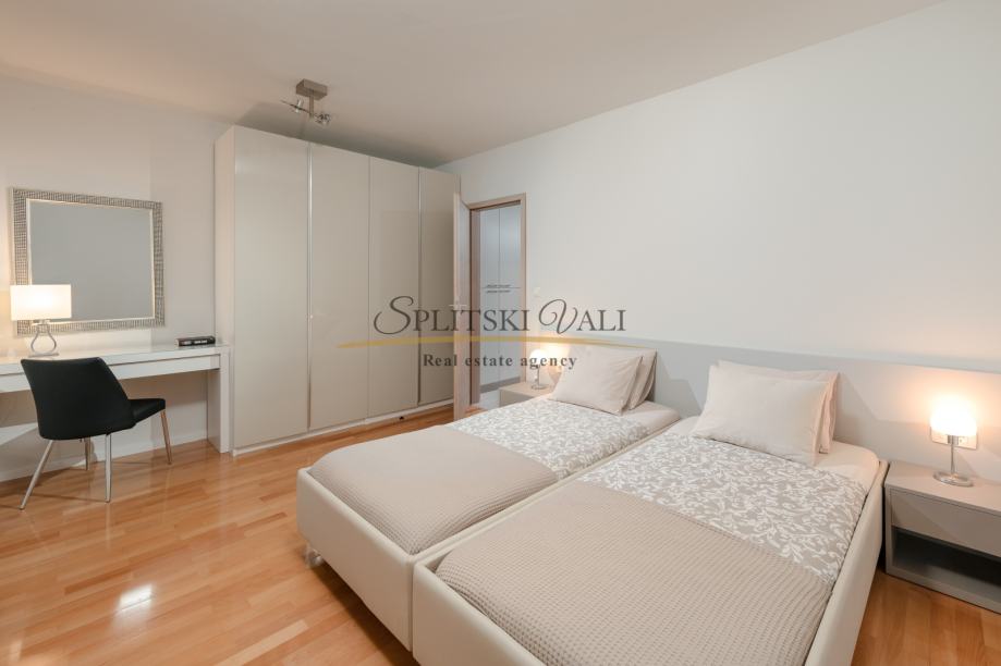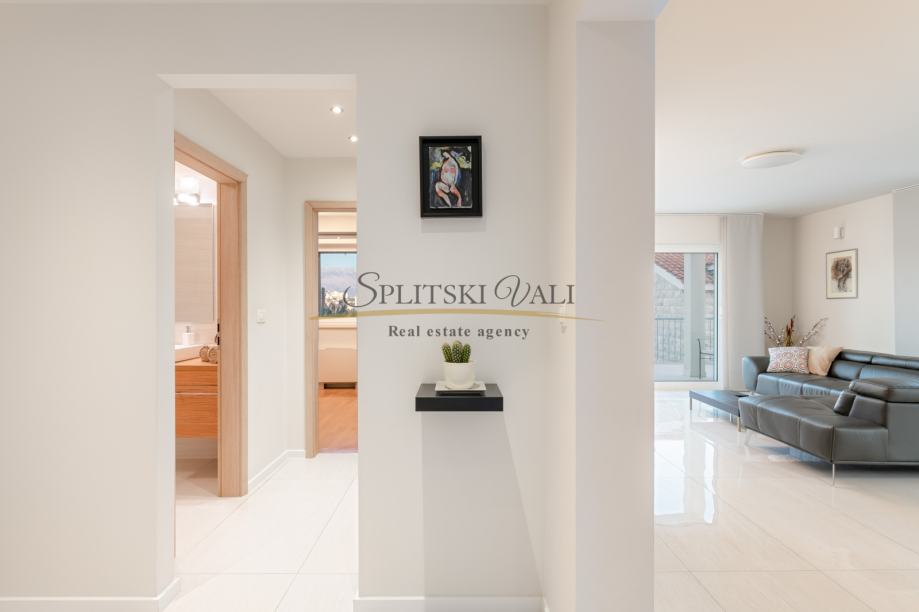 Stan se sastoji od tri sobe, hodnika, kuhinje s blagovaonom, dnevnog boravka, dva predsoblja, kupatila, WC-a i ostave, te pripadajućih bakona/terase sveukupno 125,91 m2. Parking mjesto.