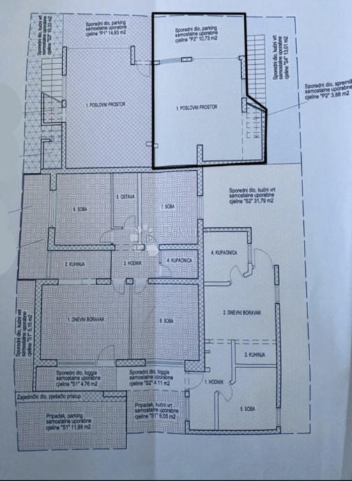 Poslovni prostor se sastoji od glavne prostorije i spremišta, s vlastitim parkingom ispred ulaza, a iznad se nalazi terasa povezana sa stubištem stana. Trenutno je u aktivnom najmu, što omogućuje nastavak najma bez dodatnih ulaganja. Dodatni potencijal postoji kroz nadogradnju ili povezivanje s gornjim dijelom stambene jedinice.