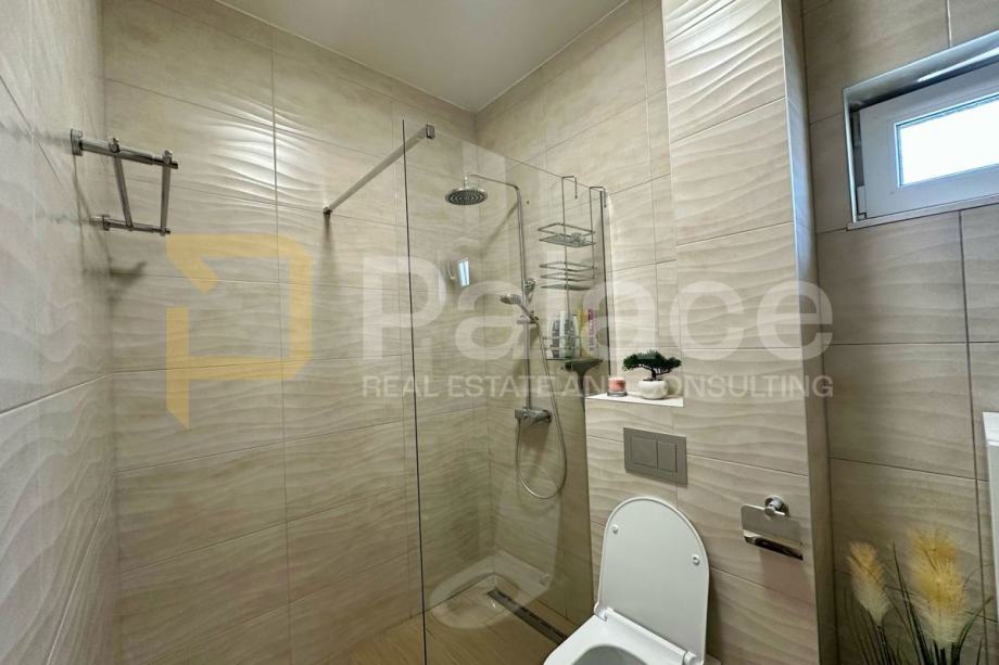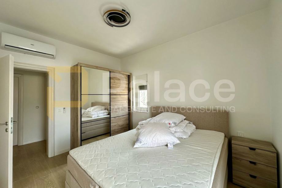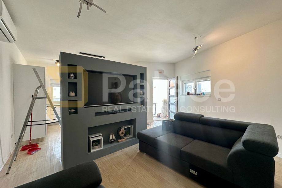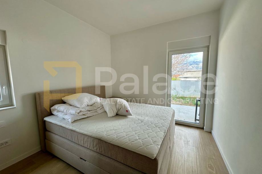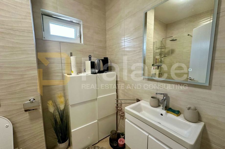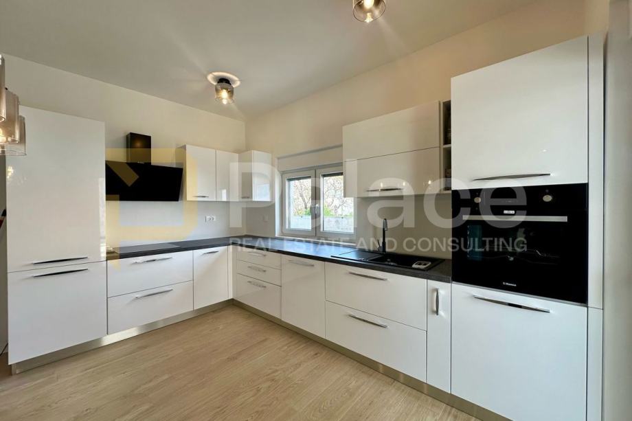 Stan se sastoji od kuhinje s blagovaonicom, prostranog dnevnog boravka, hodnika koji vodi do dvije spavaće sobe s izlazom u dvorište, ostave, vešeraja i moderno uređene kupaonice.