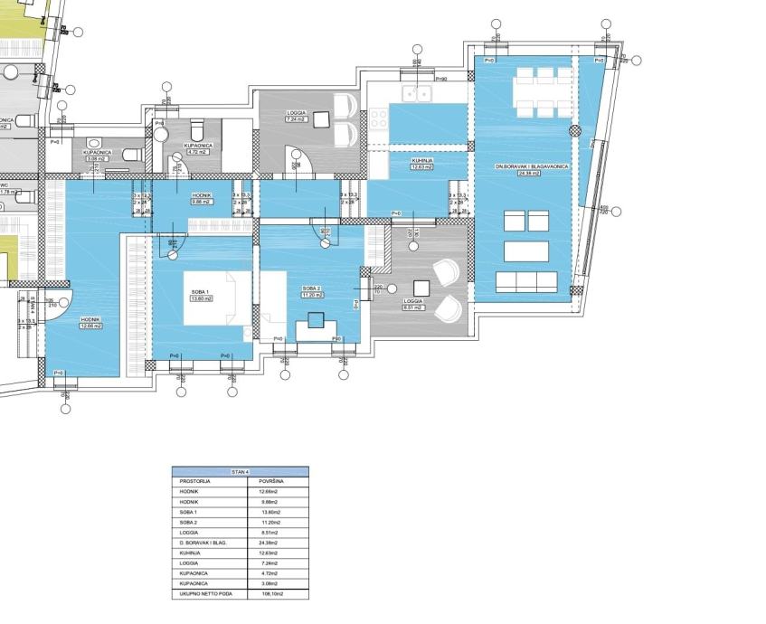 S2 – Prodaje se 3-sobni stan ukupne površine 102.40m2 + dvije loggie 7,24m2 i 8,51m2. Stan je smješten na 1 katu, a sastoji se od: hodnik, dvije kupaonice, dvije spavaće sobe, loggia, kuhinje i dnevnog boravka s blagovaonicom.