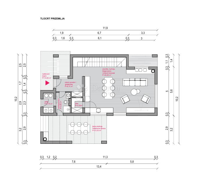 Prizemlje: ulazni hodnik, prostrani dnevni boravak otvorenog koncepta, kuhinja i blagovaonica, WC, tehnička prostorija i ostava.