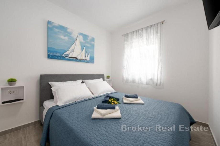 Raspored obuhvaća ulazni prostor, kupaonicu, dodatni toalet, tri spavaće sobe, kuhinju, blagovaonicu i dnevni boravak s izlazom na natkrivenu terasu koja pruža pogled na more. Apartman je komforan, funkcionalno raspoređen i u potpunosti namješten te opremljen. Opremljen je klima uređajem, kvalitetnom PVC stolarijom s ugrađenim komarnicima te se prodaje spreman za useljenje. Dokumentacija nekretnine je uredna.