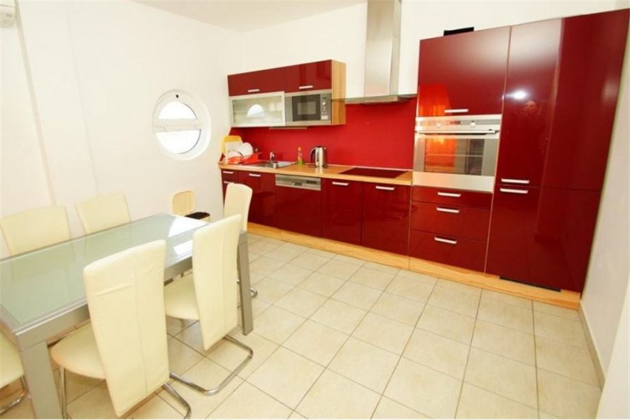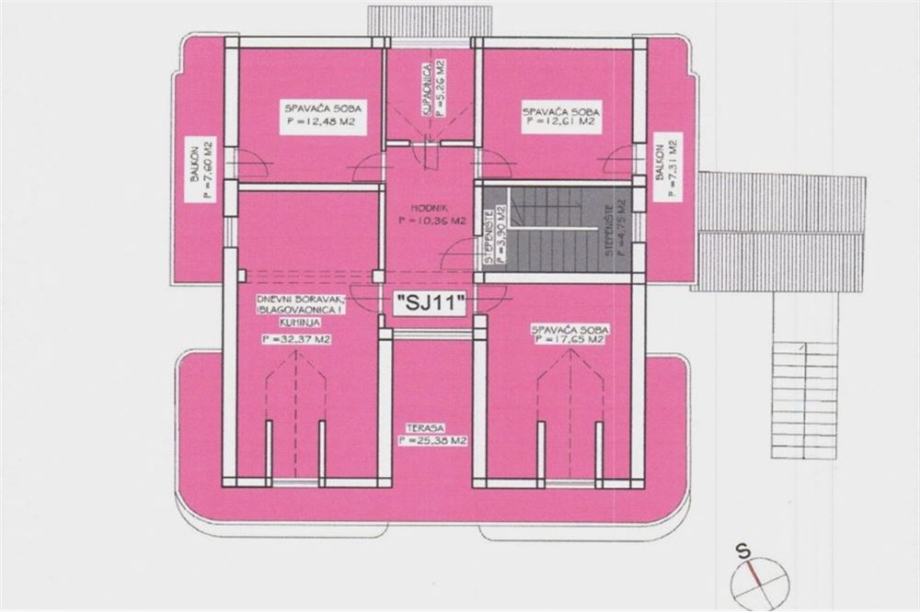 smješten je u potkrovlju zgrade, a sastoji se od: tri spavaće sobe, kupaonice, hodnika, kuhinje s blagovaonicom, dnevnog boravka, terase i dva balkona.