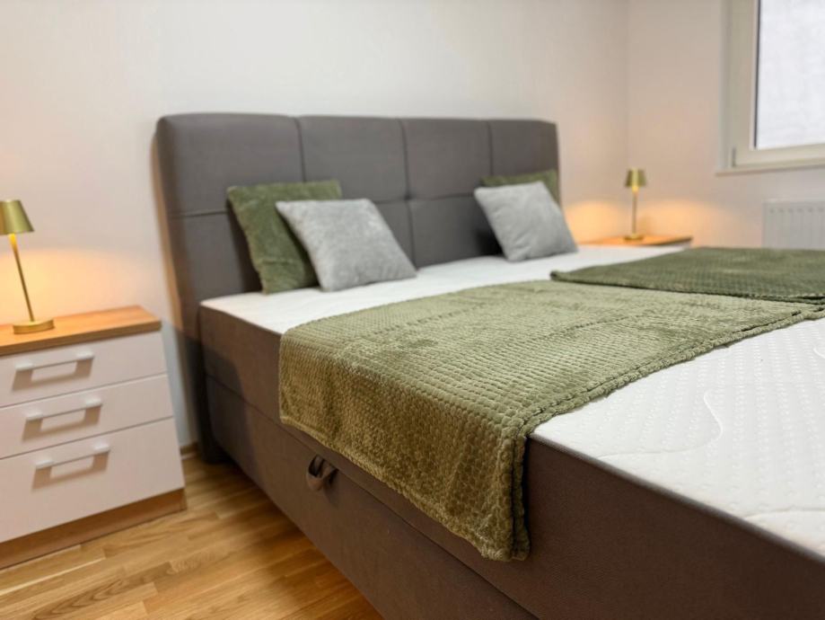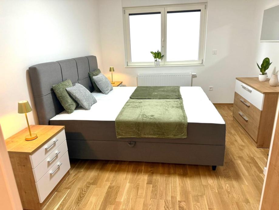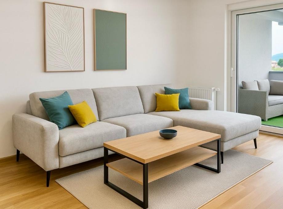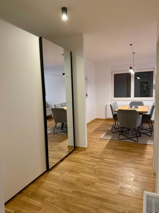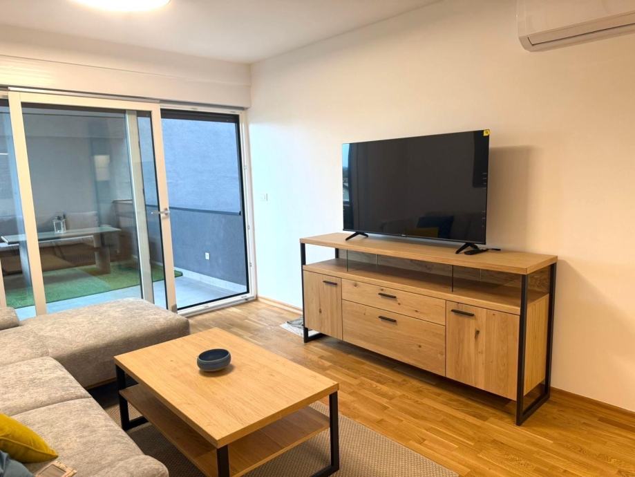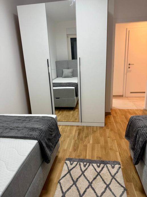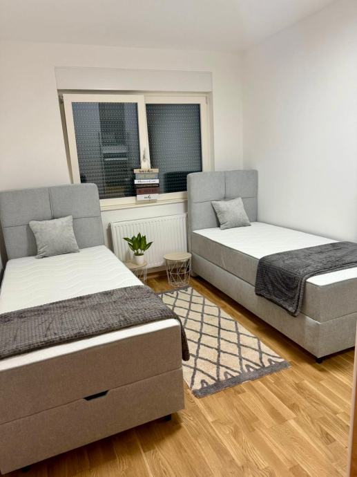 Iznajmljuje se novi , kompletno namješteni stan na 2 katu stambene zgrade od ukupno 5 katova .