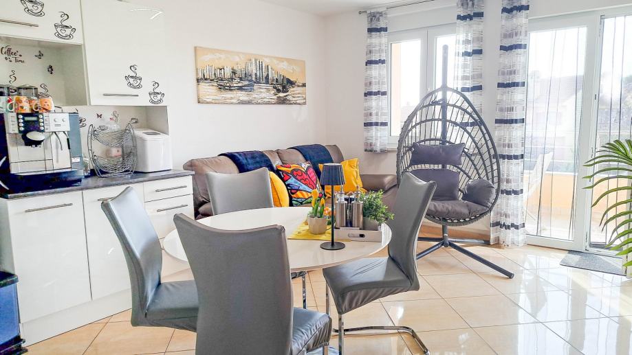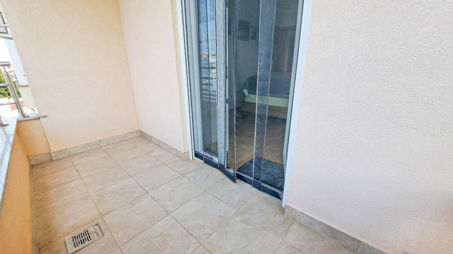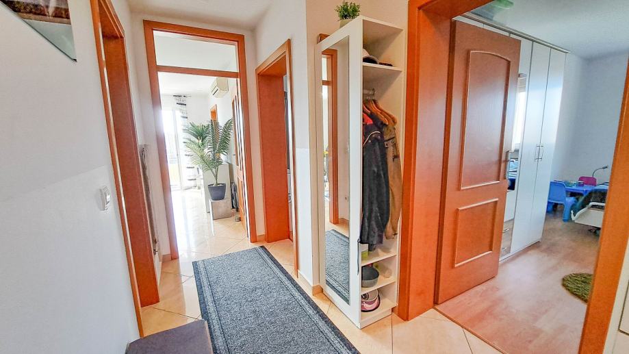 Sastoji se od open-space dnevnog boravka s kuhinjom i blagovaonicom, tri spavaće sobe, dvije kupaonice, dvije terase te hodnika. Veća terasa ima lijep pogled na more. Stanu pripada jedno parkirno mjesto. Stan se prodaje potpuno namješten kao na slikama.