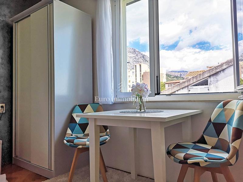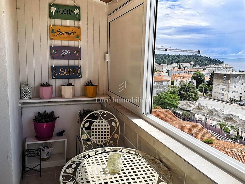 Namješten trosobni stan u samom centru Makarske, s lijepim pogledom na more. Stan ima površinu 80 m² i nalazi se na trećem katu zgrade starije gradnje bez lifta.
