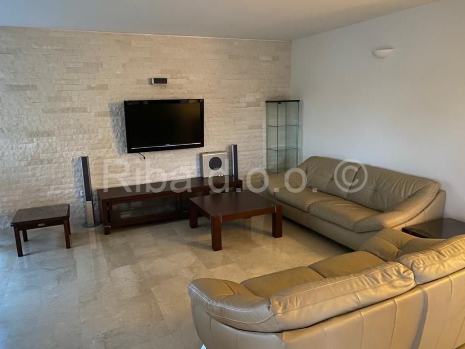 Stan se sastoji od tri spavaće sobe, kupaonice, wc-a, kuhinje + blagovaonica, dnevni boravak i terase. U cijeni je i podrumski dio koje se može koristit kao dodatan apartman. Tu se nalazi posebno etažirana garsonijera s terasom i velim dvorištem. Praonica, spremište i konoba su također u podrumu zgrade. Stanu pripadaju i vanjska parkirna mjesta te garaža od 25m2.