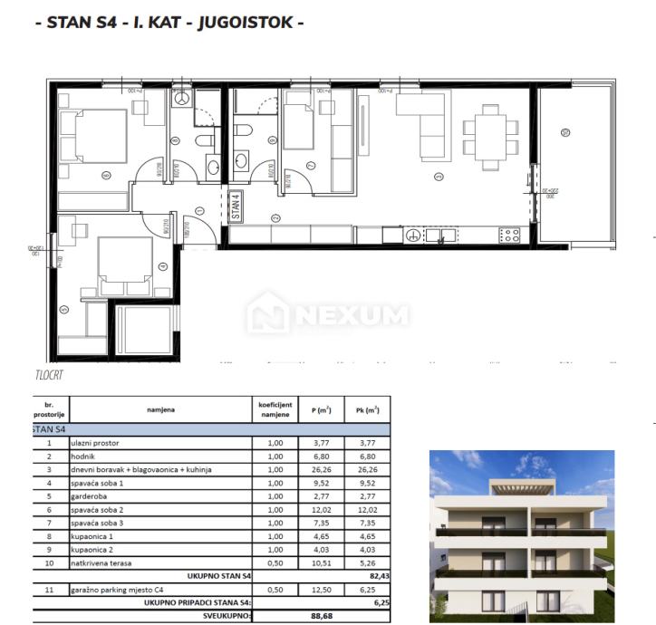 Na prodaju je prostran i funkcionalan trosobni stan s dvije kupaonice, garderobom i natkrivenom terasom, idealan za obiteljski život ili dugoročno ulaganje.