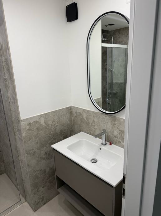 Stan je jednoetažan, orijentiran prema sjeveru i jugu, što znači da je osvjetljenje raspoređeno kroz dan. Hodnik je prostran, s ugrađenim ormarima koji nude solidnu količinu prostora za odlaganje. Dnevni boravak opremljen je kožnom garniturom, stolićem i komodom. Uz stan se nalazi lođa. Kupaonica je opremljena tuškabinonom, a stan ima i klimatizaciju.