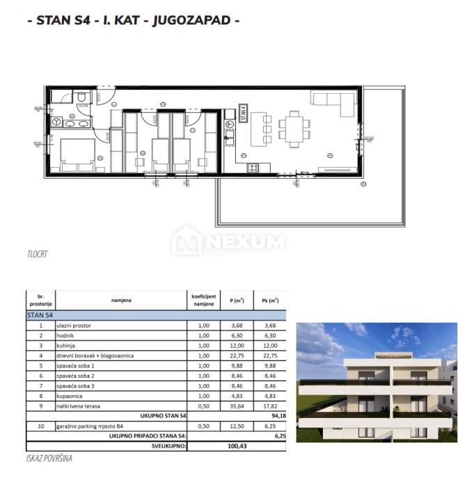 Na prodaju je prostran i funkcionalan trosobni stan s ukupnom unutarnjom površinom od 76,36 m², kojem pripada i velika natkrivena terasa površine 35,64 m², idealna za boravak na otvorenom tijekom cijele godine.