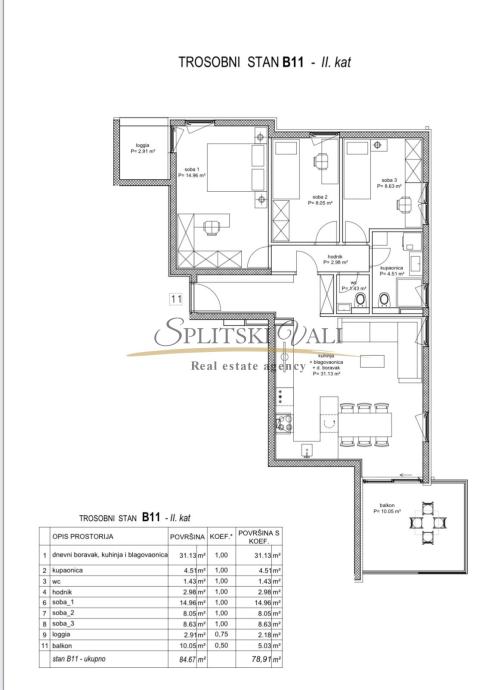 Stan se sastoji od dnevnog boravka s kuhinjom i blagovaonicom, tri spavaće sobe, kupaonice, dodatnog WC-a, hodnika, loggie i balkona površine 10,05 m². Ukupna obračunska površina iznosi 78,91 m². Tlocrt i detaljna specifikacija nalaze se u slikama oglasa.