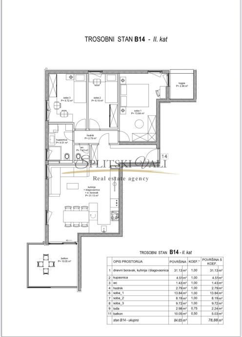 Stan se sastoji od dnevnog boravka s kuhinjom i blagovaonicom, tri spavaće sobe, kupaonice, dodatnog WC-a, hodnika, loggie i balkona površine 10,05 m². Ukupna obračunska površina iznosi 78,88 m². Tlocrt i detaljna specifikacija nalaze se u slikama oglasa.