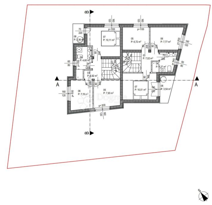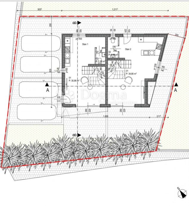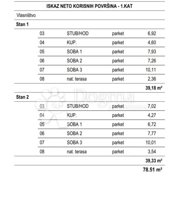Stan se sastoji od open space prostora kuhinje, blagavaonice i dnevnog boravka (34,66m2) te WC-a (2,88m2) koji se nalaze na donjoj etaži stana (prizemlju). Na drugoj etaži se nalazi hodnik (6,92m2), kupaonica (4,27m2) te 3 spavaće sobe (6,72m2, 7,77m2 i 10,01m2) te natkrivena terase (3,54m2) s koje će se pružati predivan pogled na more i otoke.