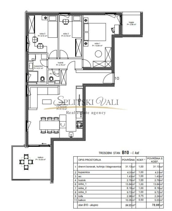 Stan se sastoji od dnevnog boravka s kuhinjom i blagovaonicom, tri spavaće sobe, kupaonice, dodatnog WC-a, hodnika, loggie i balkona površine 10,05 m². Ukupna obračunska površina iznosi 78,88 m². Tlocrt i detaljna specifikacija nalaze se u slikama oglasa.