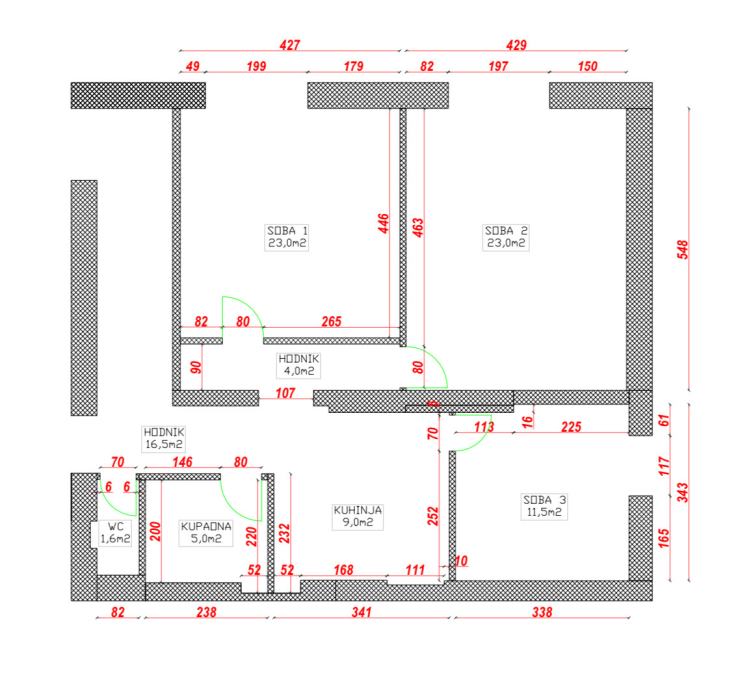 Ukupna površina stana je 92 m2 + balkon 7,5 m2 na koji se izlazi iz dvije vece sobe.