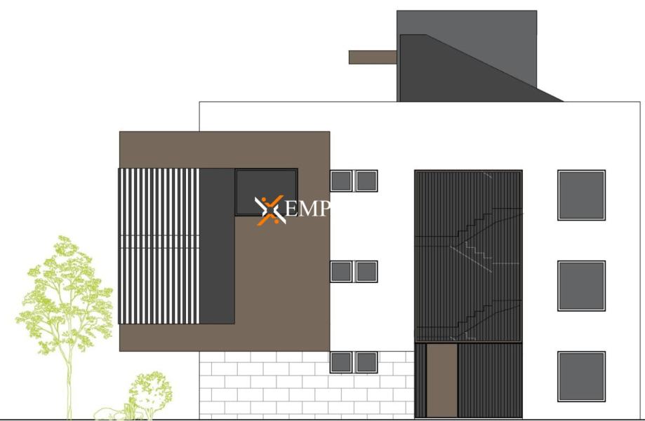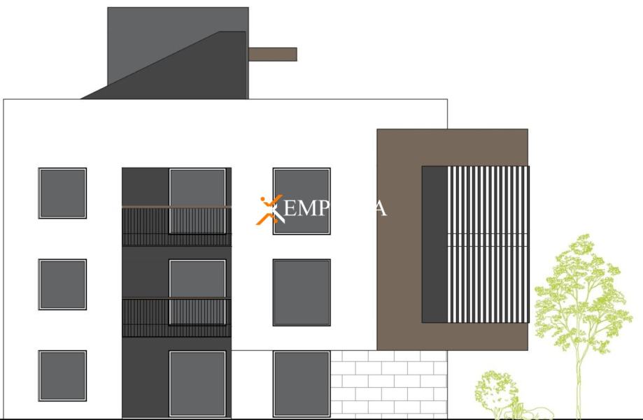 Raspored čine hodnik, dvije spavaće sobe, treća spavaća soba s vlastitom kupaonicom, dodatna kupaonica, kuhinja s blagovaonicom i dnevnim boravkom, lođa i natkrivena terasa. Neto korisna površina iznosi 112,88 m². Stanu pripada vrt površine oko 100 m² te dva parkirna mjesta. Ukupna neto površina s pripacima iznosi 127,88 m².OpremaStan je izgrađen ciglenim termo blokovima i opremljen aluminijskom stolarijom s troslojnim staklom, električnim roletama i komarnicima. Fasada je izolirana sa 10 cm stiropora, a podovi su izvedeni u kombinaciji pločica i parketa.