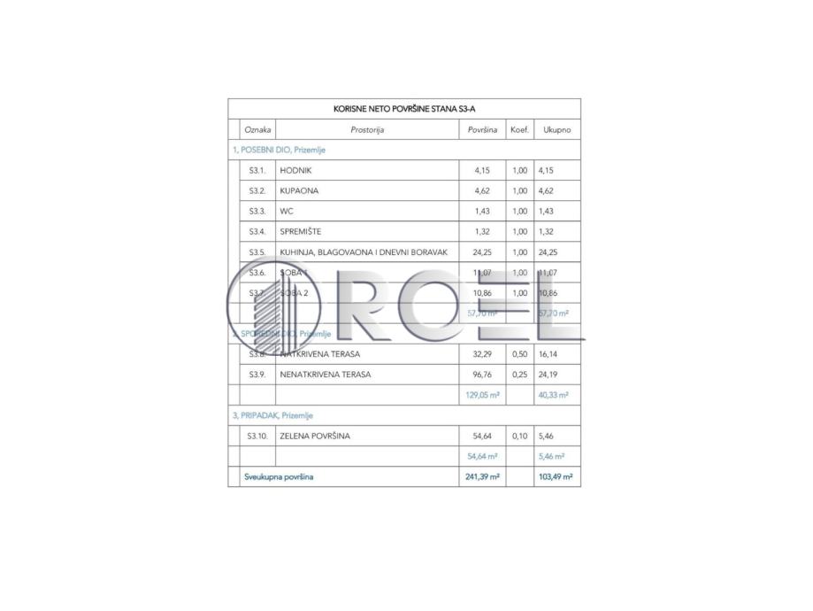Stan se nalazi u prizemlju moderne novogradnje s liftom, NKP 108 m2. Vrlo moderan dizajn zgrade te građeno po najvišim standardima. Sastoji se od hodnika (4.15 m2), ostave (1.32 m2), kupaonice (4.62 m2), toaleta (1.43 m2), kuhinje, dnevnog boravka i blagovaonice (24.25 m2), dvije spavaće sobe (11.07 i 10.86 m2) te natkrivene i nenatkrivene terase (40.33 m2) i vrta veličine 60 m2 (6 m2). Stambena površina stana iznosi 57.70 m2.