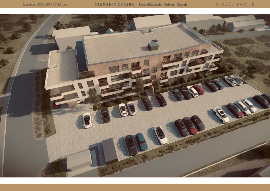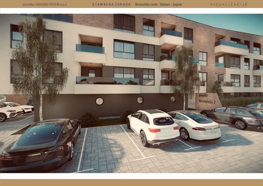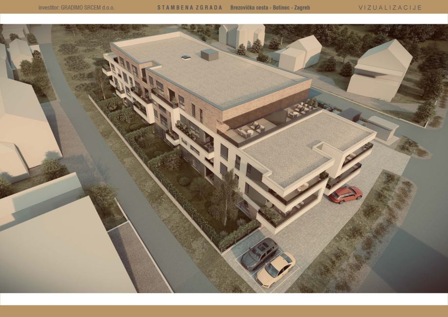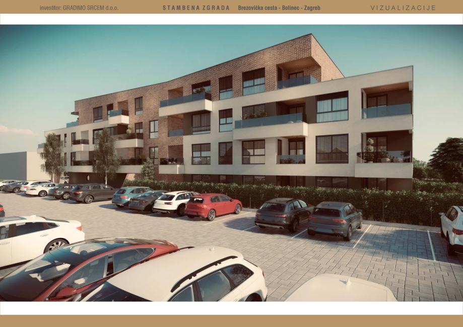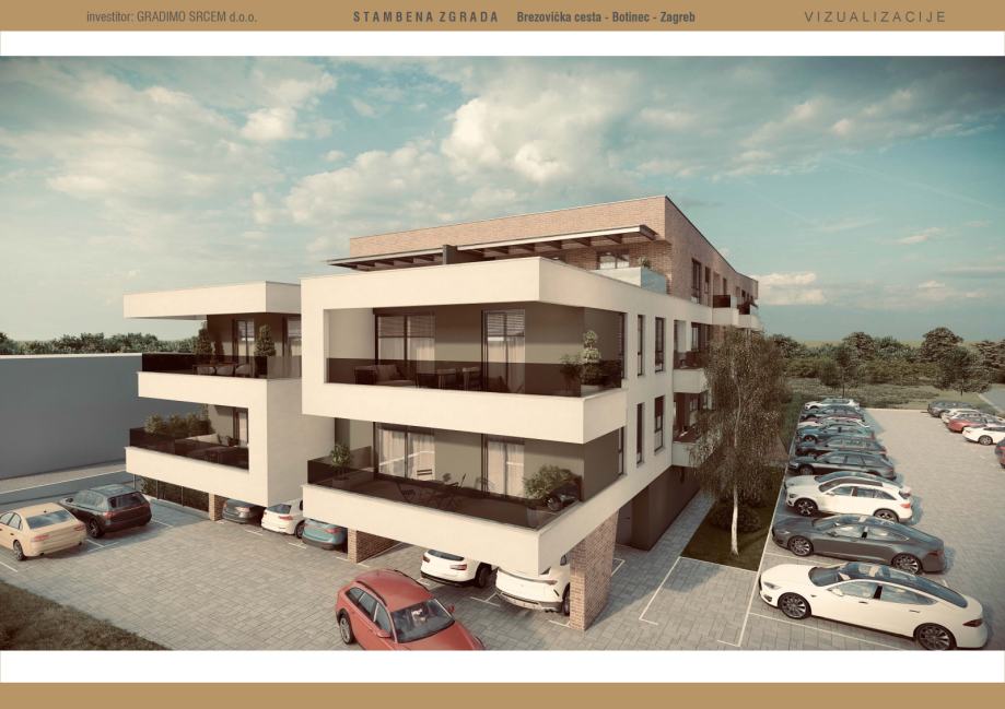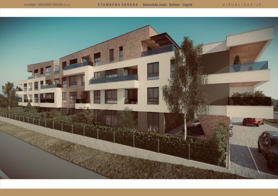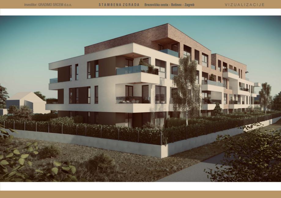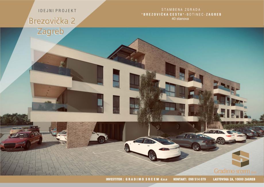 "PROJEKT BREZOVIČKA 2" - Samarijanac d.o.o. - Gradimo srcem d.o.o. počeo je sa izgradnjom luksuznih stanova na novoj lokaciji Zagreb - Botinec - Brezovička cesta, stanovi površine od 36,97 m2 - 82,00 m2, zgrada se sastoji od PR+P1+P2+UVK, zgrada ima lift, natkrivena parkirna mjesta, vanjska parkirna mjesta i spremišta, odlična lokacija i kvalitetna gradnja, etažno plinsko podno grijanje.