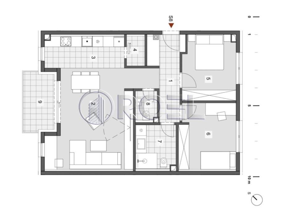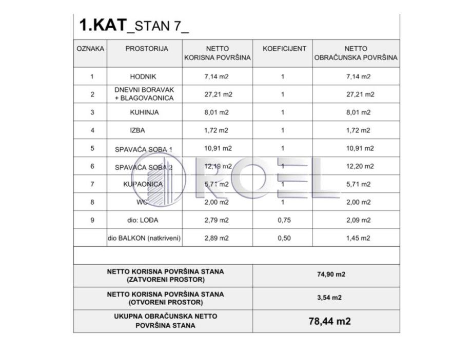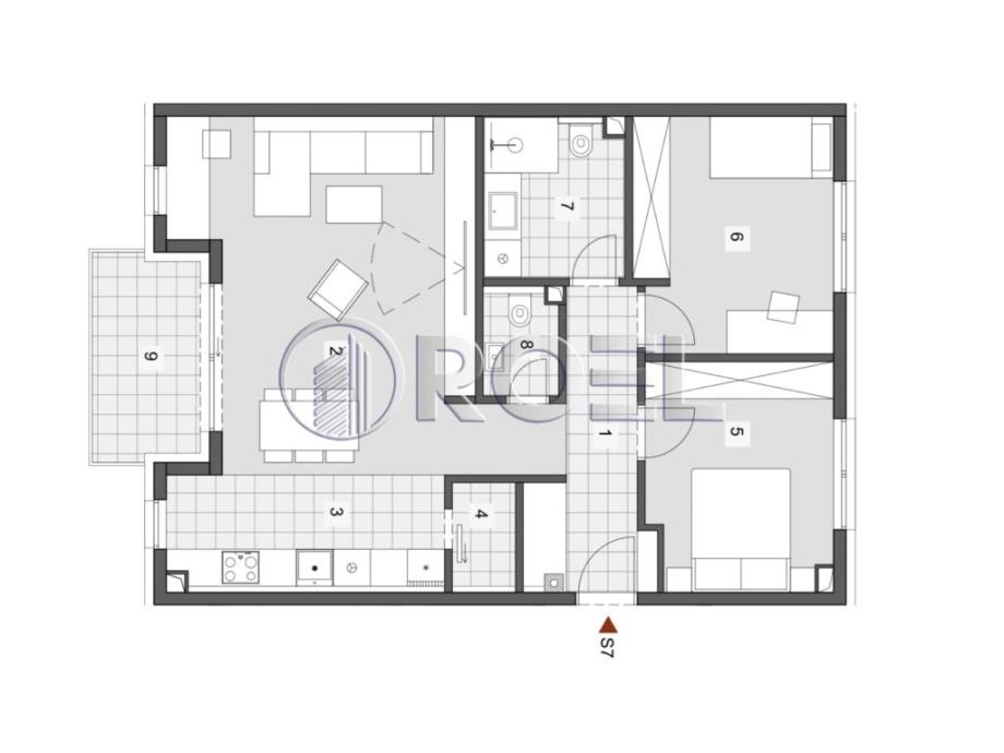 Trosobni stan S7 nalazit će se na prvom katu novogradnje, NKP 78.44 m2. Zgrada će imati 18 stambenih jedinica. Oblikovni koncept činit će 3 volumena sa dvostrešnim krovom, povezani uvučenim ’cezurama’ sa ravnim krovom. Dva volumena su katnosti prizemlje 2 kata potkrovlje, dok je središnji volumen katnosti prizemlje 2 kata. Prizemlje je uvučeno sa svoje zapadne strane gdje je omogućeno natkriveno vanjsko parkiranje za 15 vozila, dok je ostalih 10 vanjskih parkirnih mjesta smješteno sa južne strane, uz ulicu. Stan će se sastojati od ulaznog hodnika ( 7.14 m2), kupaonice s wc-om ( 5.71 m2), toaleta ( 2 m2), dnevnog boravka s blagovaonom ( 27.21 m2) i kuhinje ( 8.01 m2) s izlazom na djelomično natkriveni balkon, izbe ( 1.72 m2) te dvije spavaće sobe veličine 10.91 m2 i 12.20 m2. Stambena površina stana ( zatvoreni dio) iznosi 74.90 m2. Dostupni su stanovi S8 i S10 istog rasporeda i slične kvadrature ( 77.38 m2 i 78.54 m2) na istom katu ( prvom) te stanovi S13 i S14 istog rasporeda i slične kvadrature ( 77.71 m2 i 76.65 m2) na drugom katu. U prizemlju će se nalaziti 4 jednosobna stana i zajedničko spremište. Stanovi će biti opremljeni PVC stolarijom anatracit izvana, a iznutra bijela boja, klima uređajem, protuprovalnim vratima i video portafonom. Podovi u stanovima će biti obloženi parketom i keramikom. Grijanje u stanovima će biti podno na dizalice topline. Uz stanove je obvezna kupnja vanjskog natkrivenog ili nenatkrivenog parkirnog mjesta. Trosobni stanovi na prvom i drugom katu će biti dvostrano ili trostrano orijentirani, ovisno o tlocrtnoj poziciji.