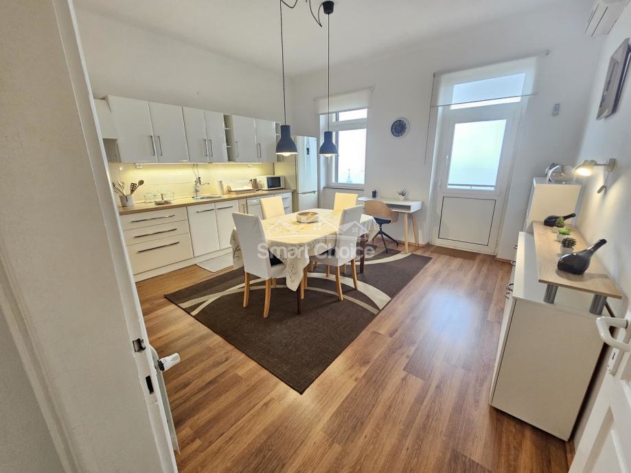 Trsat - prekrasno uređen stan pun svijetla s pogledom na more i grad. Sastoji se od 2 spavaće sobe, kuhinje s blagovaonom, dnevnog boravka, balkona, kupaone, wc-a i ulaznog hodnika.