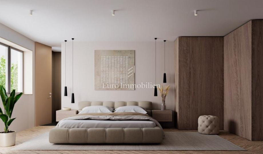 Stan je opremljen prema visokim standardima: podno grijanje putem dizalice topline, klima uređaji u svim prostorijama, troslojna ALU stolarija, podizno-klizne stijene, kvalitetni podovi i vrhunska keramika.