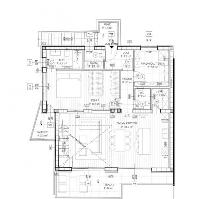 Stan je funkcionalno raspoređen kroz dvije etaže. Donja etaža obuhvaća prostrani dnevni boravak otvorenog koncepta s kuhinjom i blagovaonicom, izlaz na terasu, spavaću sobu s vlastitom kupaonicom i balkonom, ostavu te vešeraj. Na gornjoj etaži nalaze se dvije dodatne spavaće sobe, kupaonica, prostor pogodan za radni kutak ili home office te krovna terasa koja pruža dodatnu privatnost i prostor za opuštanje.