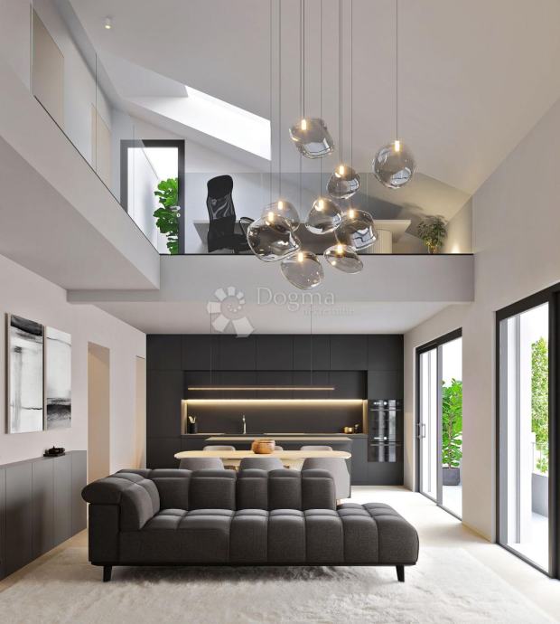 Donja etaža nudi open space dnevni boravak s kuhinjom i blagovaonicom, izlaz na prostranu terasu, master spavaću sobu s vlastitom kupaonicom i balkonom, ostavu i vešeraj. Gornja etaža sadrži dvije velike spavaće sobe, kupaonicu, home office i krovnu terasu za potpunu privatnost.